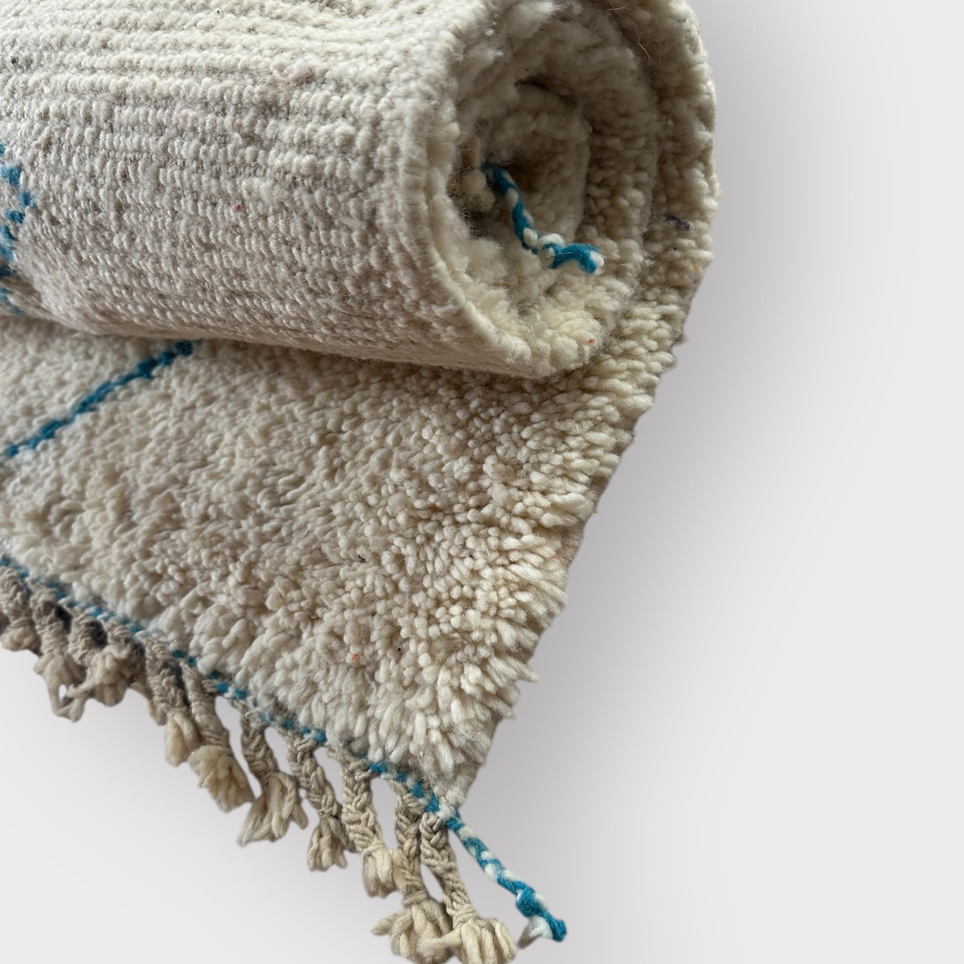 Tapis Berbère Fait Main – 100 × 140 cm – Laine naturelle & motifs bleus